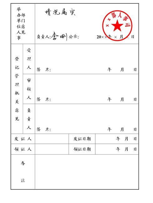 9、举办单位人事部门意见:举办单位人事部门应当对申请人填写的情况认真核查,由负责人签署审核意见,签名,加盖举办单位人事部门公章,注明日期。