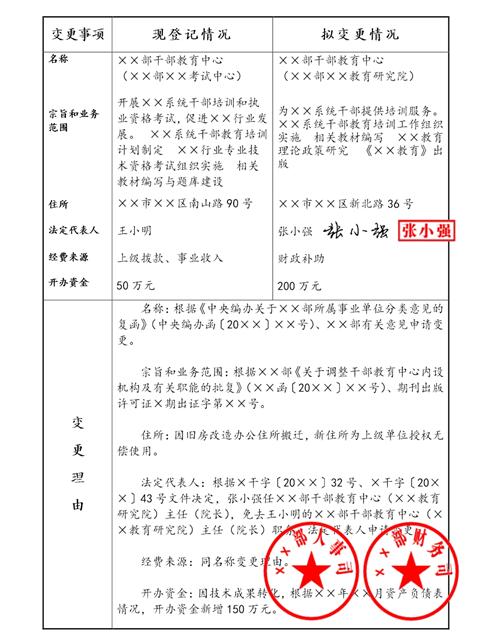 8、变更理由:逐一填写每项变更的理由(并写明依据文件的文号),加盖举办单位人事部门公章。变更开办资金的,再加盖举办单位财务部门公章。